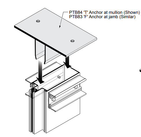 F&T clips are used to anchor the head and sill of a typical curtain wall system. The legs of the clips slide into the open ends of the vertical mullions. The F clips which only have 1 anchoring leg and are used at the jambs, while the T clips have both anchoring legs and are used at intermediate verticals.